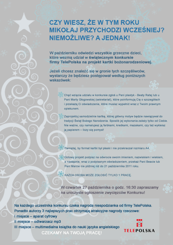 - W zeszłym roku konkurs cieszył się ogromną popularnością - mówi Agnieszka Kamińska, Kierownik ds. Trade Marketingu w spółce TelePolska – Zostaliśmy wręcz zasypani projektami kartek świątecznych i już wówczas zdecydowaliśmy, że za rok go powtórzymy. Tym razem postanowiliśmy zaprosić do zabawy podopiecznych Stowarzyszenia Centrum Młodzieży Arka. Dla dzieci będzie to nie tylko świetna zabawa, lecz i szansa na zdobycie atrakcyjnych nagród, takich jak aparat cyfrowy, mp4 czy multimedialna książka do nauki jęz. angielskiego. Ponadto warto dodać, że w naszej świątecznej zabawie nie ma przegranych i na każdego uczestnika konkursu czekać będzie nagroda niespodzianka – dodaje Agnieszka Kamińska.